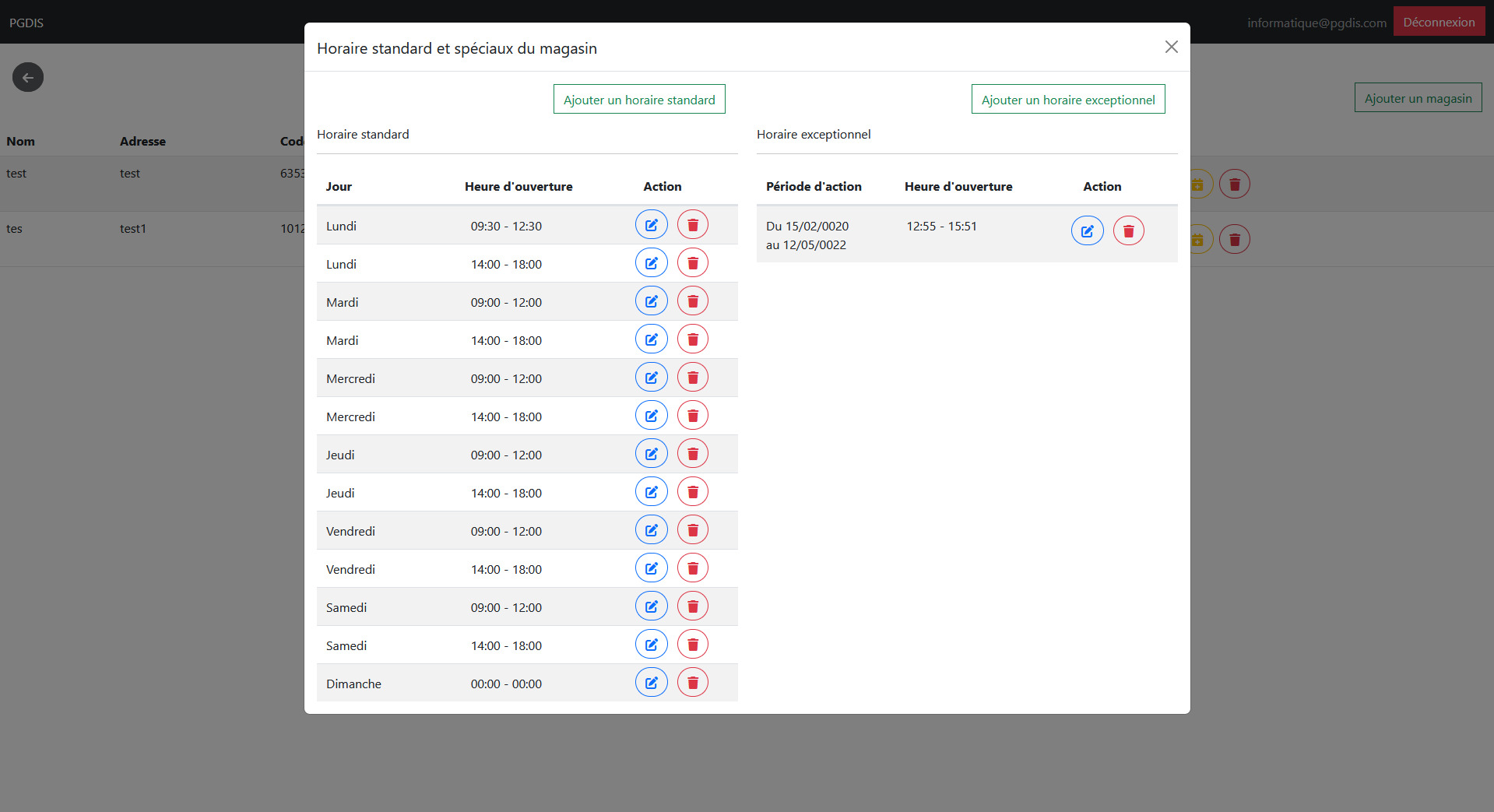 - Module Magasins : gestion des informations de chaque point de vente (coordonnées, horaires, détails complémentaires).