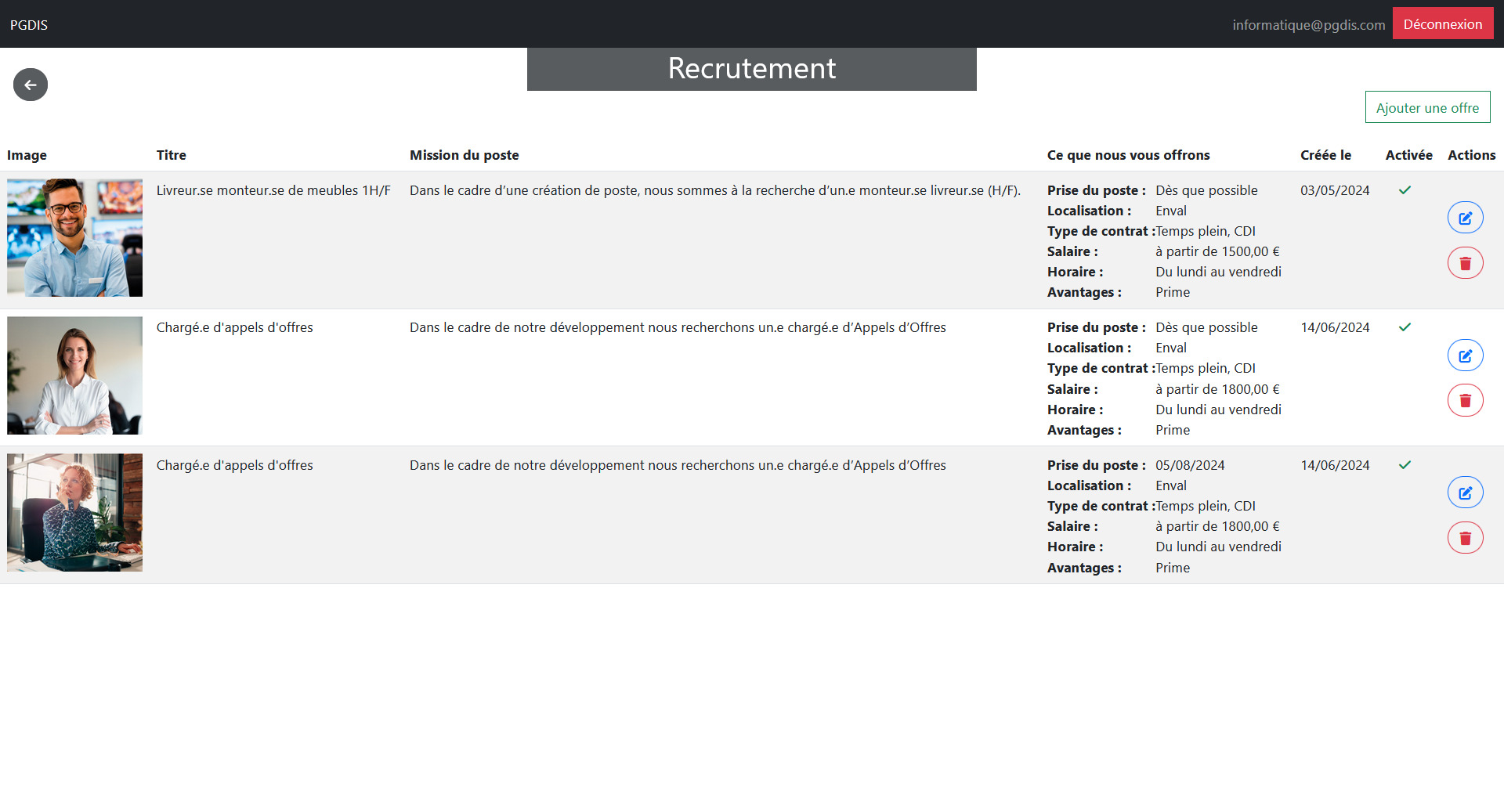 - Module Recrutement : création et publication d’offres d’emploi sur le nouveau site.