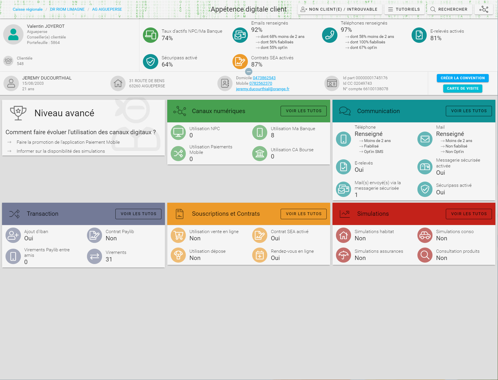 - Appétence Digital Client : Interface de suivi de l'utilisation des services digitaux par les clients, notamment via l'application mobile "Ma Banque".