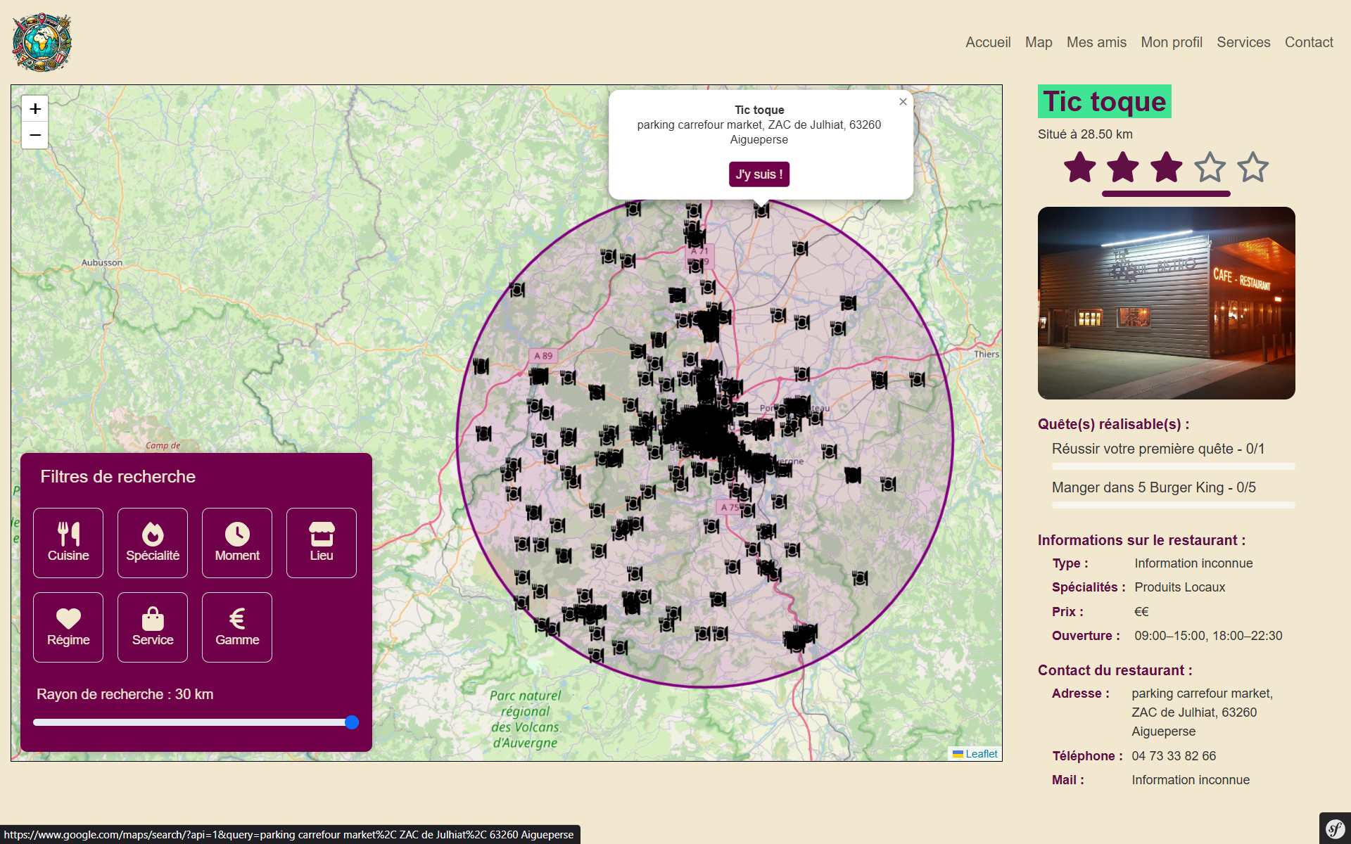 - Carte interactive intelligente : intégrée via OpenStreetMap, elle affiche les restaurants proches avec des options de filtrage avancées. Ces filtres sont alimentés par le moteur IA qui affine les résultats selon les préférences détectées et les critères des utilisateurs.
