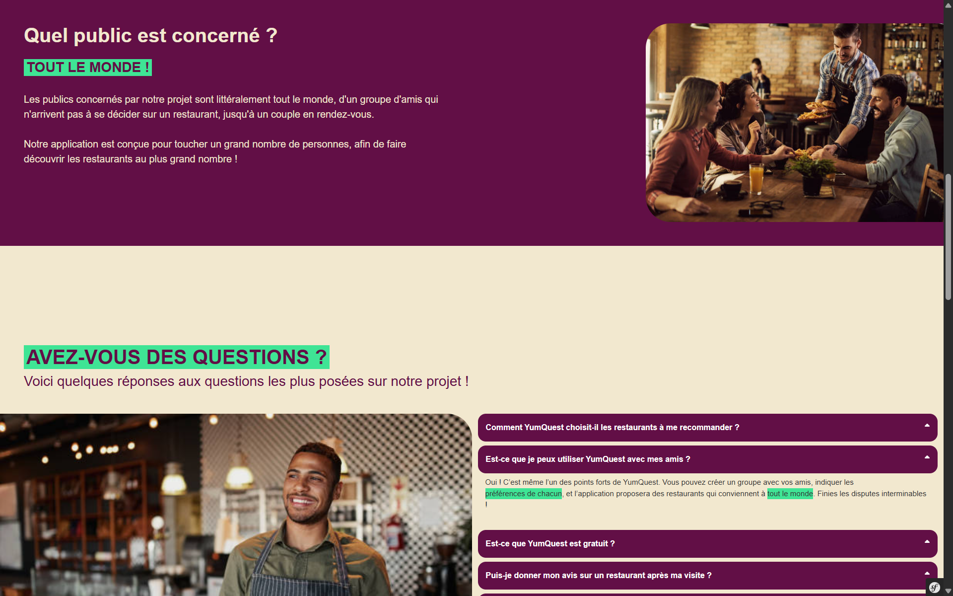 Dans le cadre de notre projet SAE de 3ème année, notre équipe de trois étudiants a développé YumQuest, une application web innovante qui facilite le choix de restaurants en groupe grâce à une expérience personnalisée et intelligente.